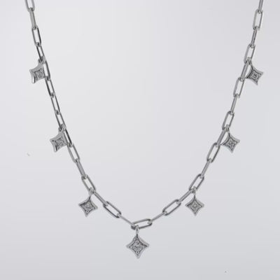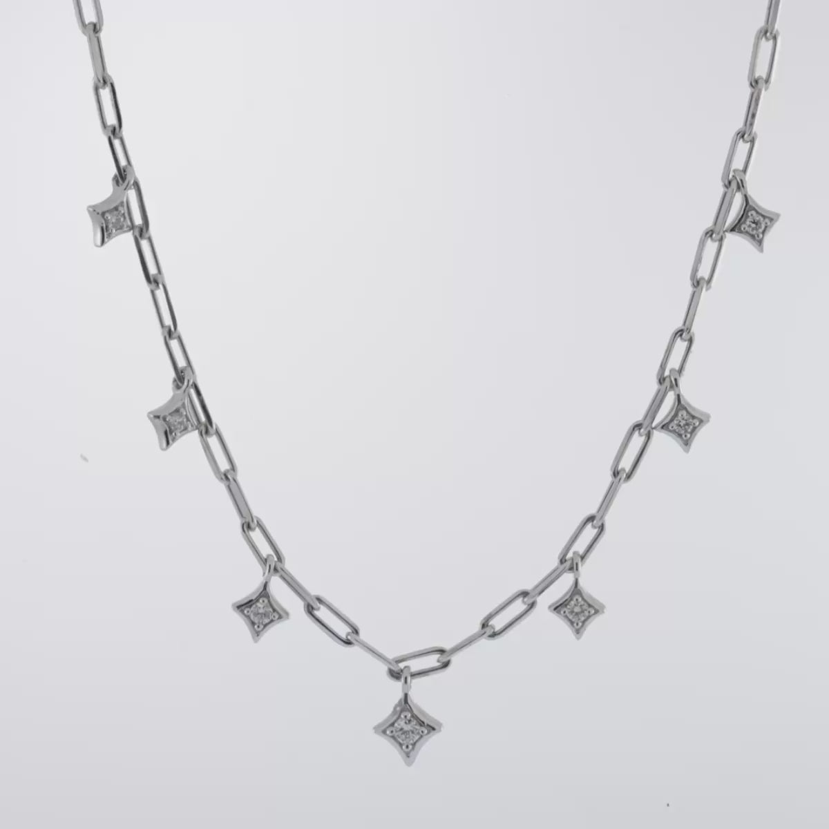 A gold-toned chain necklace with geometric diamond-shaped danglers, giving it a refined yet modern aesthetic. The pattern blends minimalist charm with playful movement, making it perfect for both everyday and layering styles.